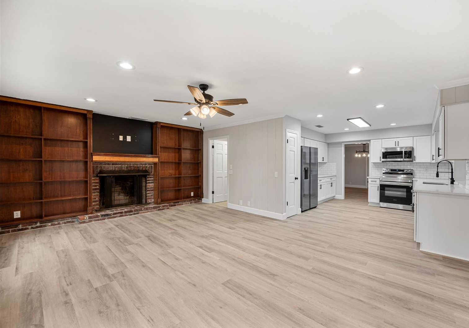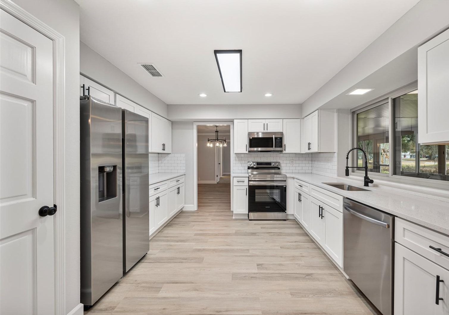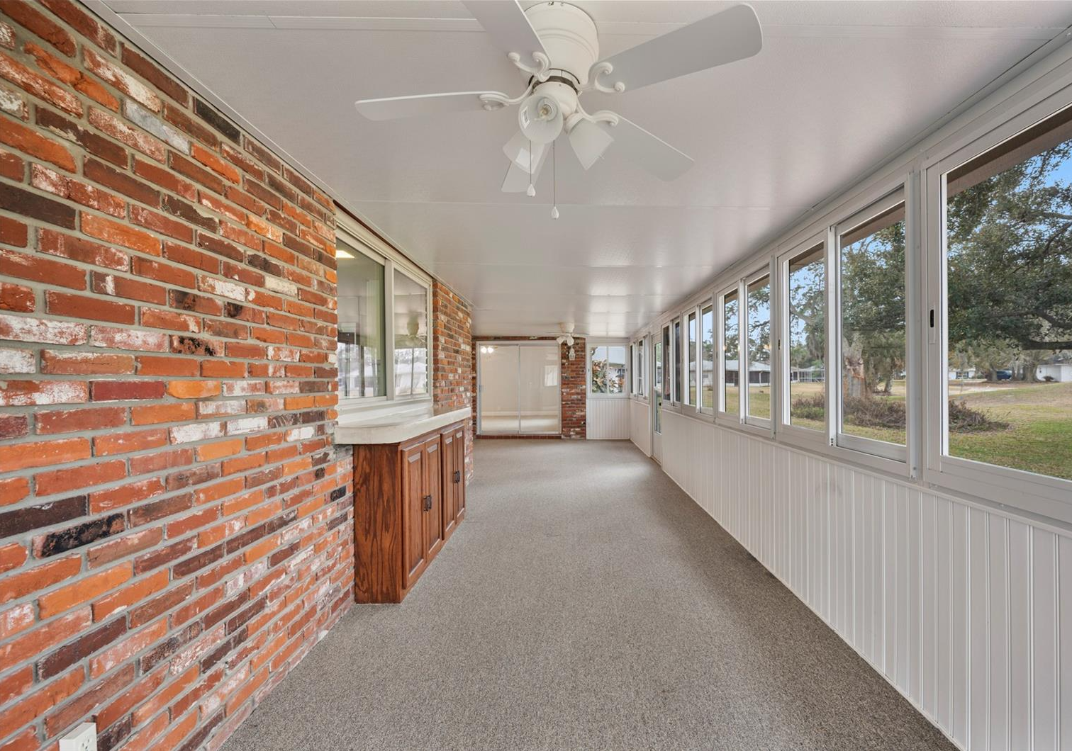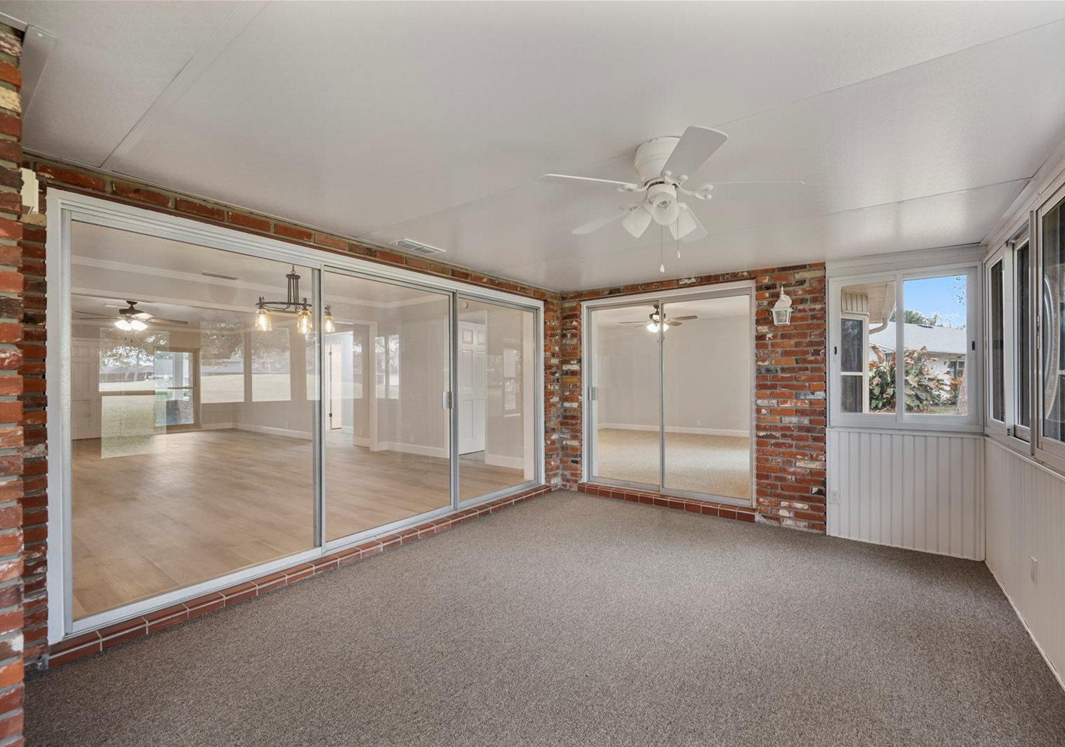 This charming 2-bedroom, 2-bathroom residence features a bright and open layout with a large living area plus an additional family room accented by a cozy brick fireplace and floor-to-ceiling wood built-ins. The brand-new kitchen has been thoughtfully updated with stainless steel appliances, quartz countertops, and all new cabinetry, along with a convenient passthrough window to the large glass-enclosed sunroom with A/C, making entertaining effortless while enjoying the view. The interior also features crown molding, new luxury vinyl plank flooring throughout the living areas, and new carpet in the bedrooms. Both bathrooms have been fully updated and include dual sink his-and-her vanities.