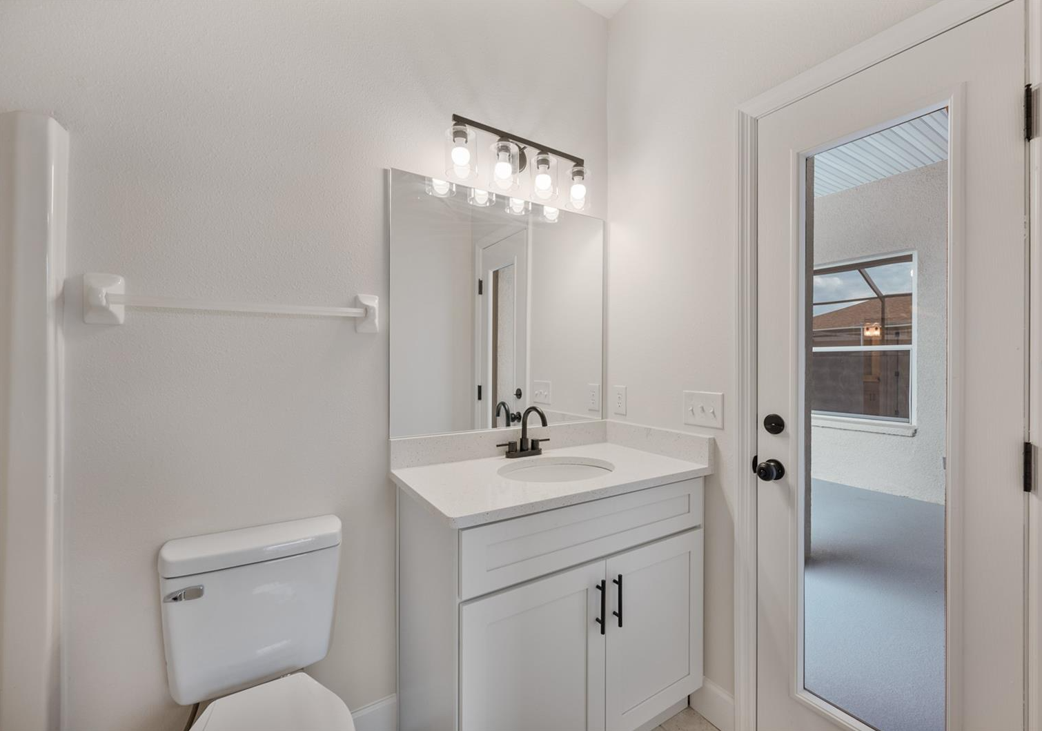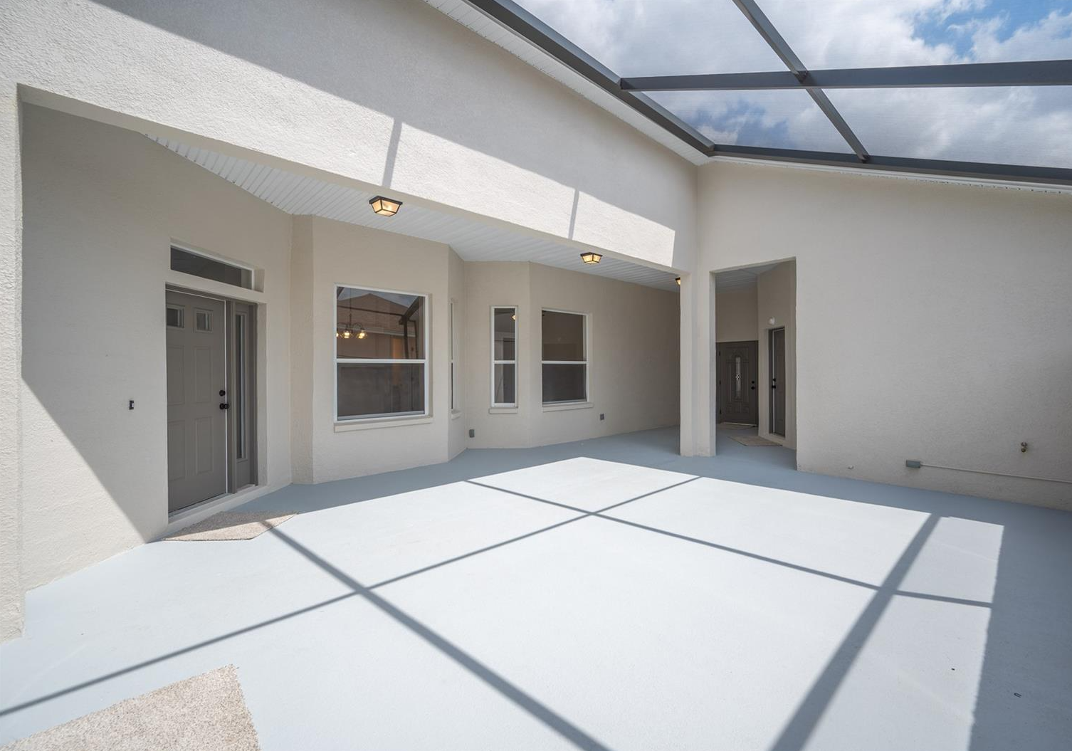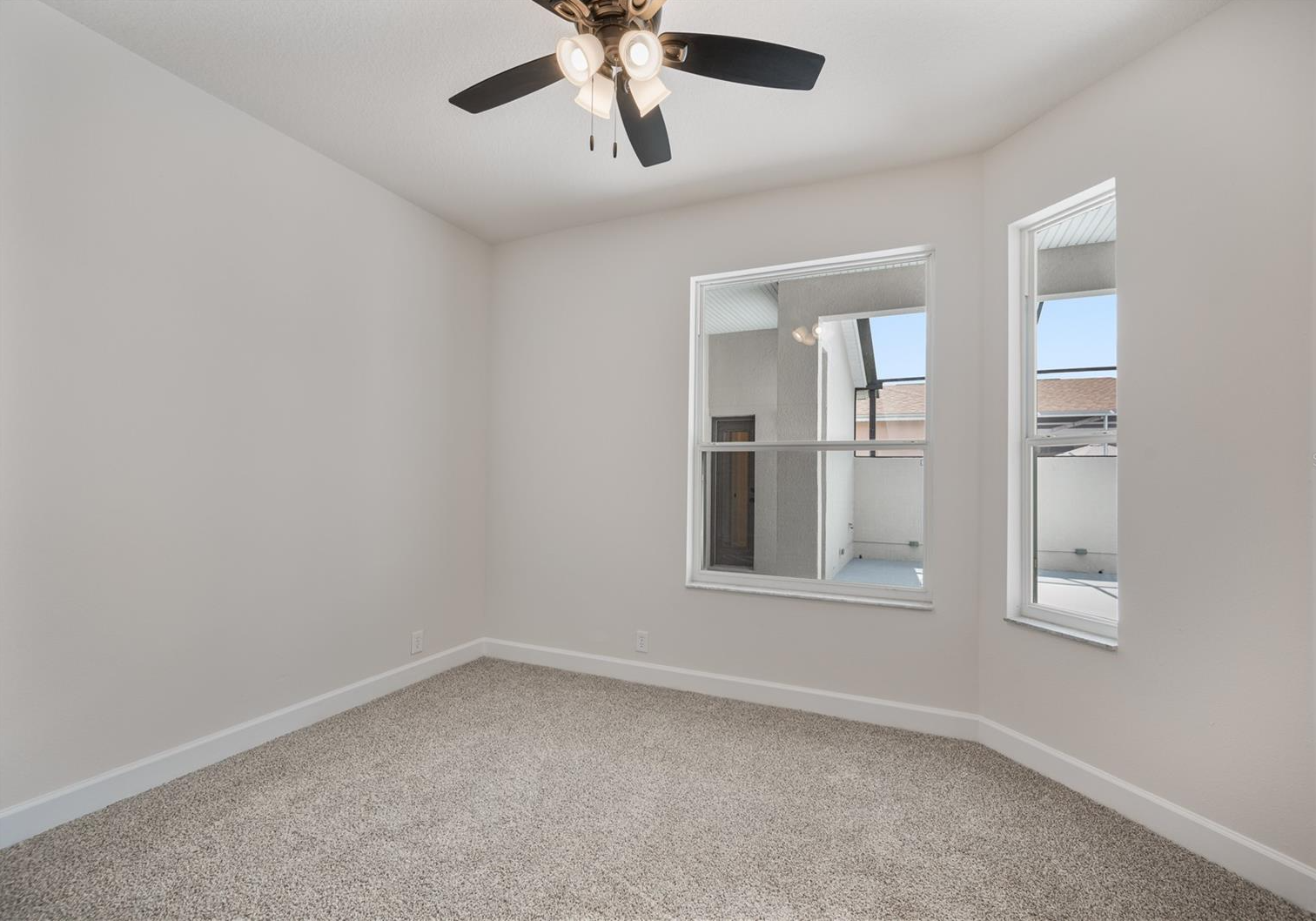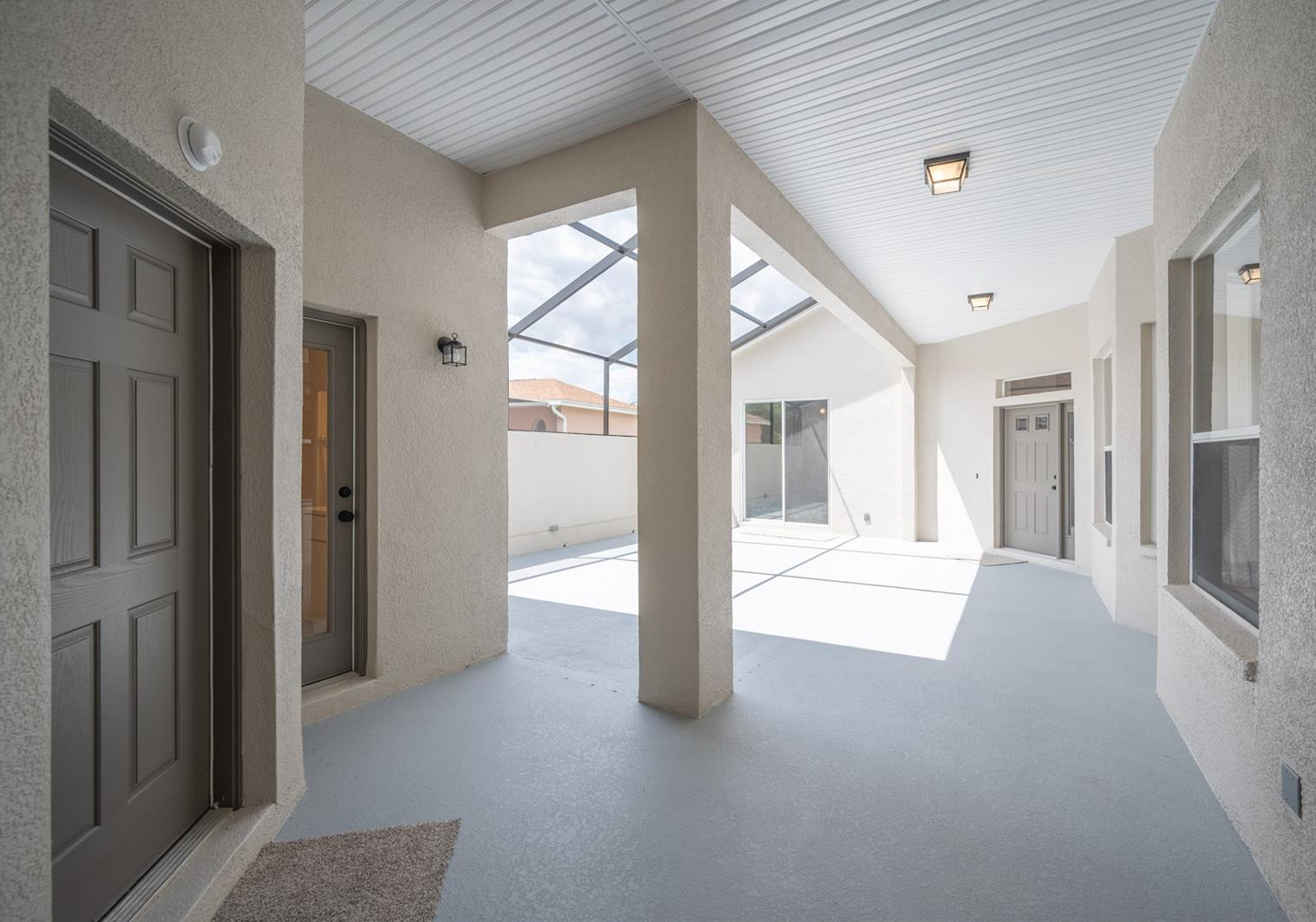 The spacious primary suite provides a relaxing retreat, complete with a large walk-in closet, linen closet, and a luxurious en suite bathroom featuring dual sinks, a soaking tub, and a generously sized walk-in shower. A sliding glass door from the primary bedroom opens directly to the screened-in courtyard, creating a private indoor-outdoor living experience. Adding to the home’s versatility is a detached bedroom with its own private bathroom, ideal for guests, older kids, in-laws, or even a home office space.