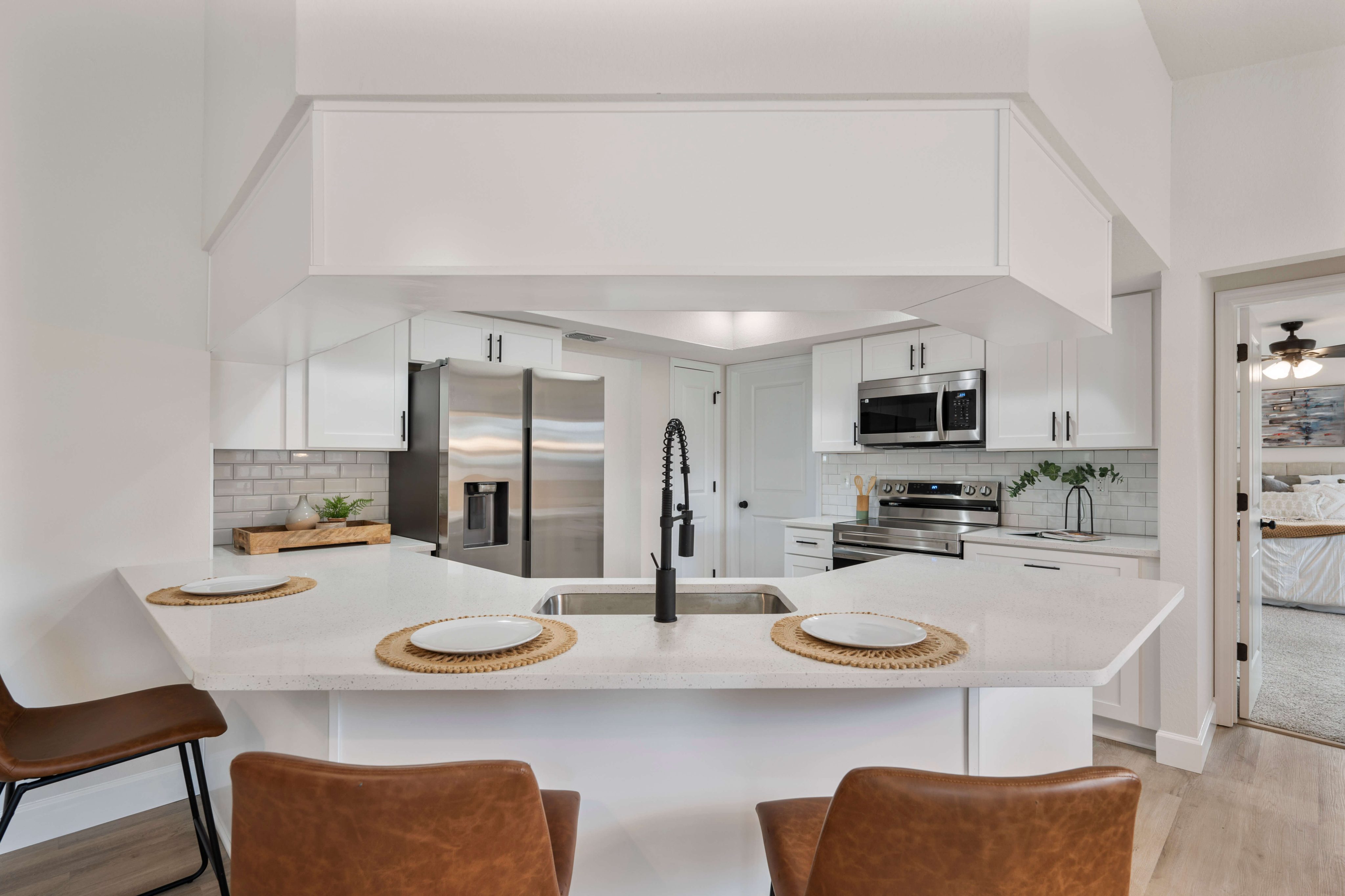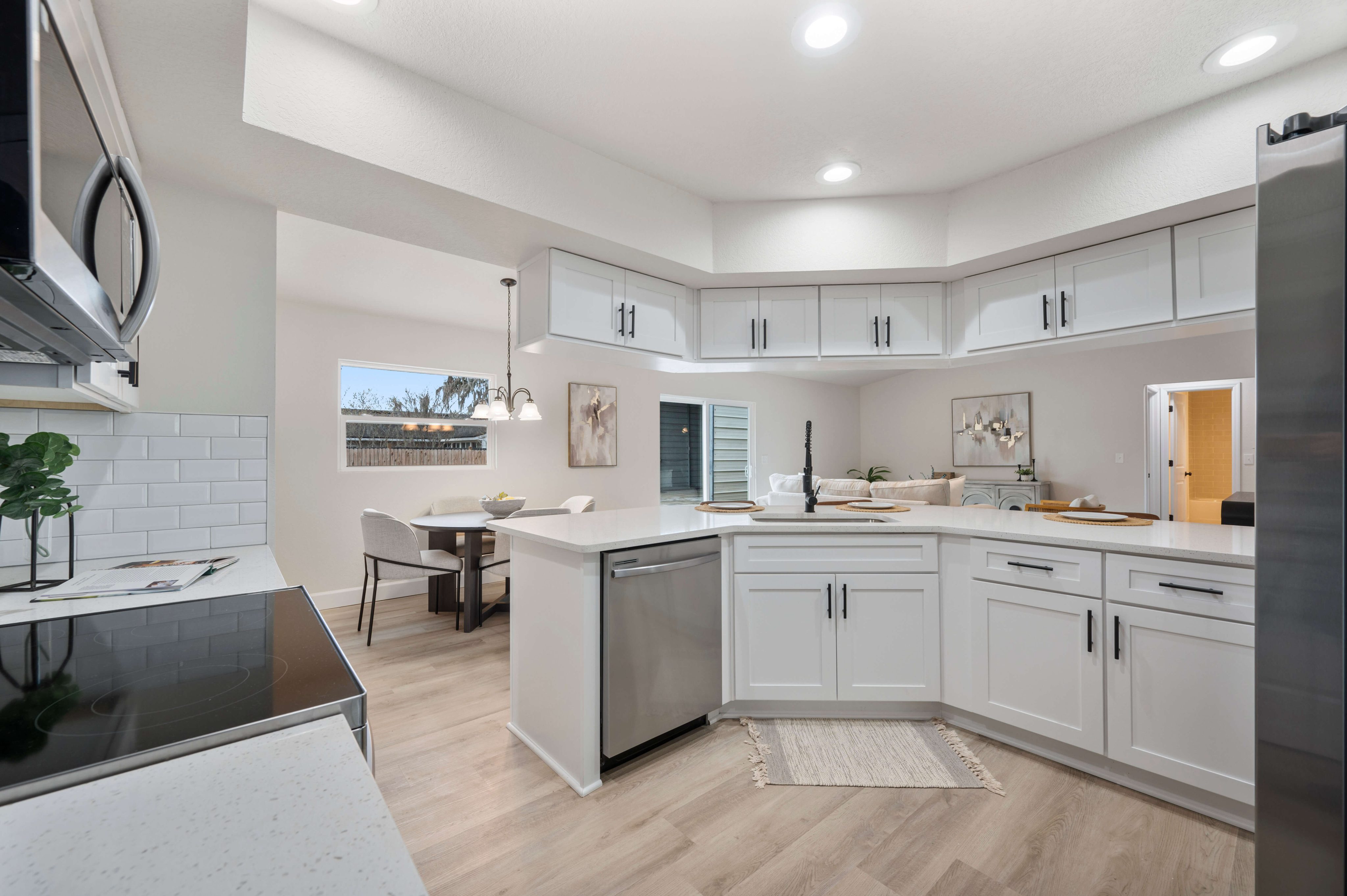 At the heart of the home is a completely updated kitchen featuring quartz countertops, new cabinetry, stainless steel appliances, a pantry, and a counter-height breakfast bar perfect for casual dining or entertaining. Adjacent to the kitchen are both an informal dining area and a separate formal dining room, offering flexibility for everyday living and special occasions.