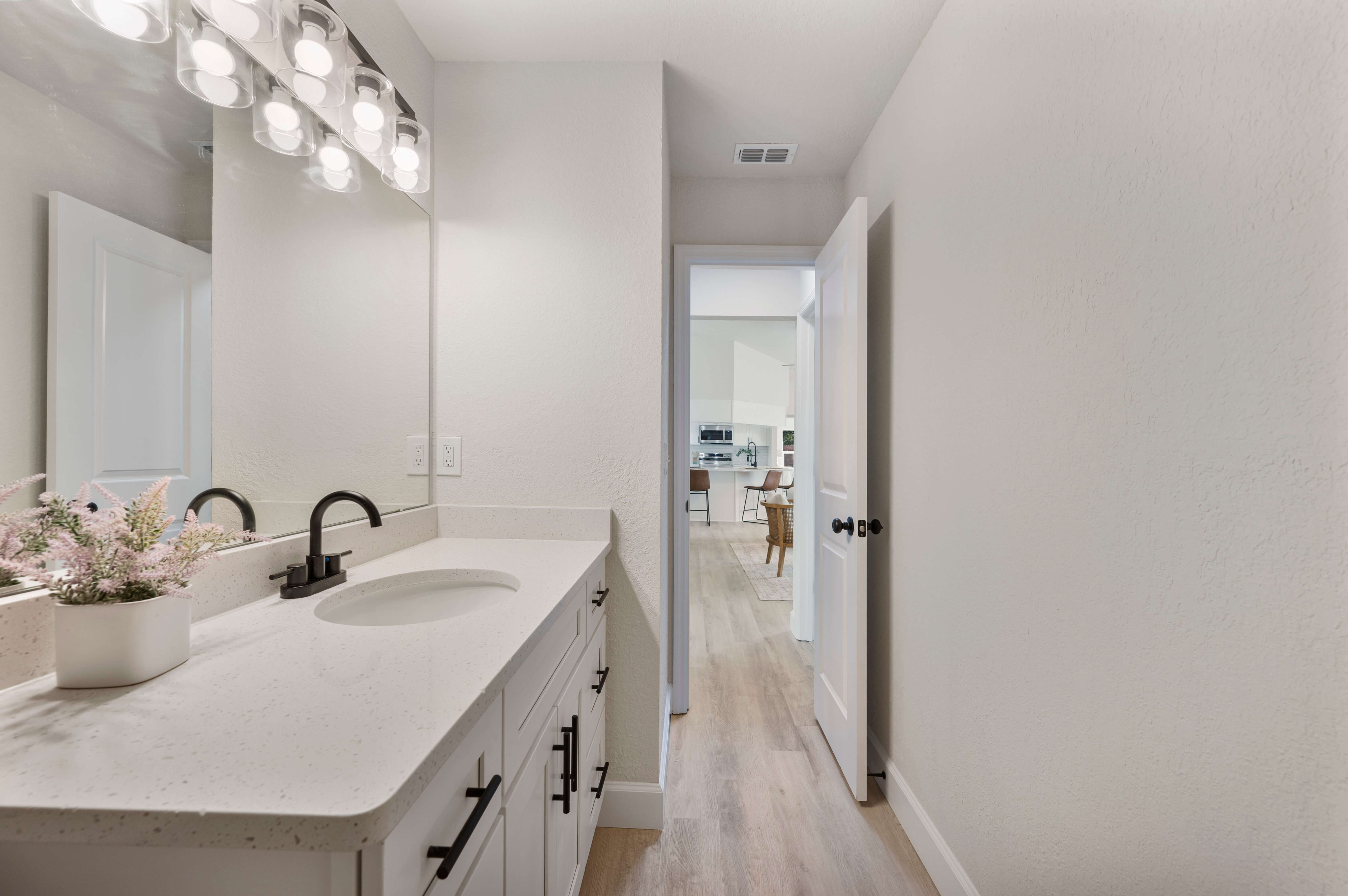 The home boasts all new luxury vinyl plank flooring throughout the main living areas and new carpet in all bedrooms. Living spaces include a comfortable living room and an inviting family room, ideal for gathering and relaxing. The spacious primary suite is a true retreat with abundant natural light and a beautifully updated ensuite bathroom showcasing a double-sink vanity, quartz countertops, and a walk-in shower. All bathrooms have been tastefully upgraded with new cabinetry, quartz surfaces, and classic subway tile in the showers. Additional highlights include a large interior laundry room and ample storage throughout the home.